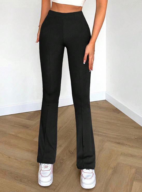 Comfortable and flattering high-waist pants with a modern flared cut. They feature a vertical ribbed texture and a stitched front seam, which elongates the leg. The stretchy fabric and secure fit make these pants perfect for both casual and elevated everyday style.