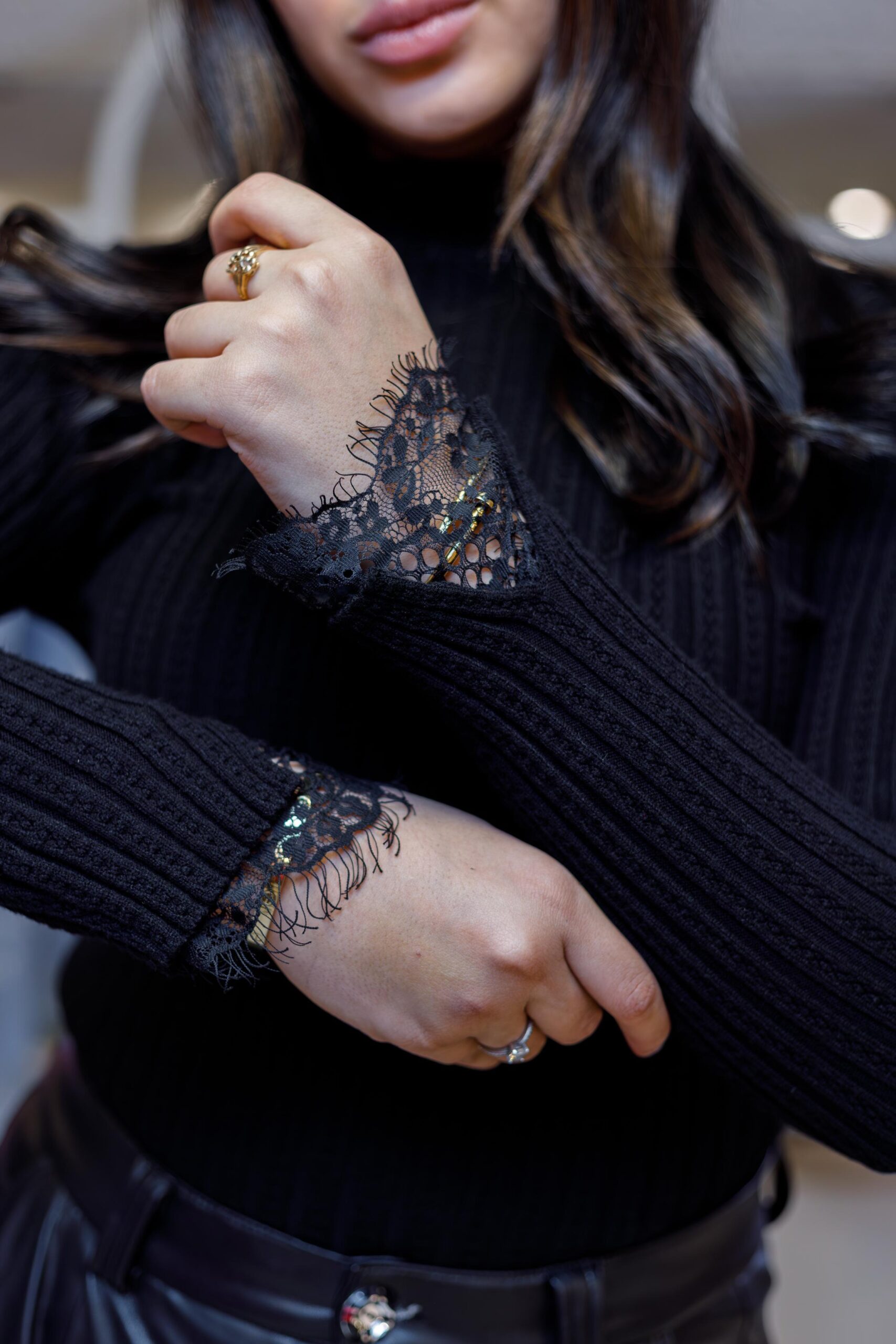 A sleek ribbed basic top designed with subtle lace-trim details on the sleeves. Soft, stretchy fabric with a flattering fit, perfect for effortless everyday styling or layering.