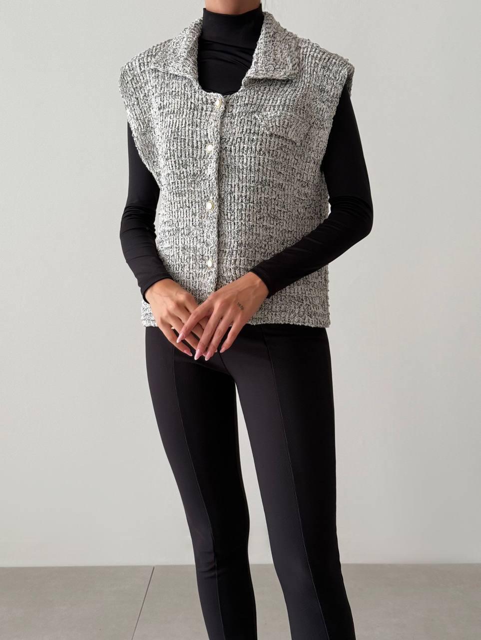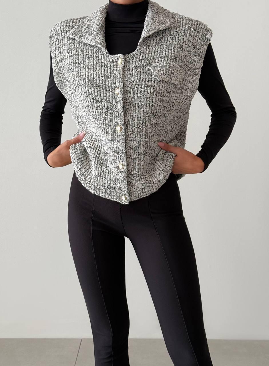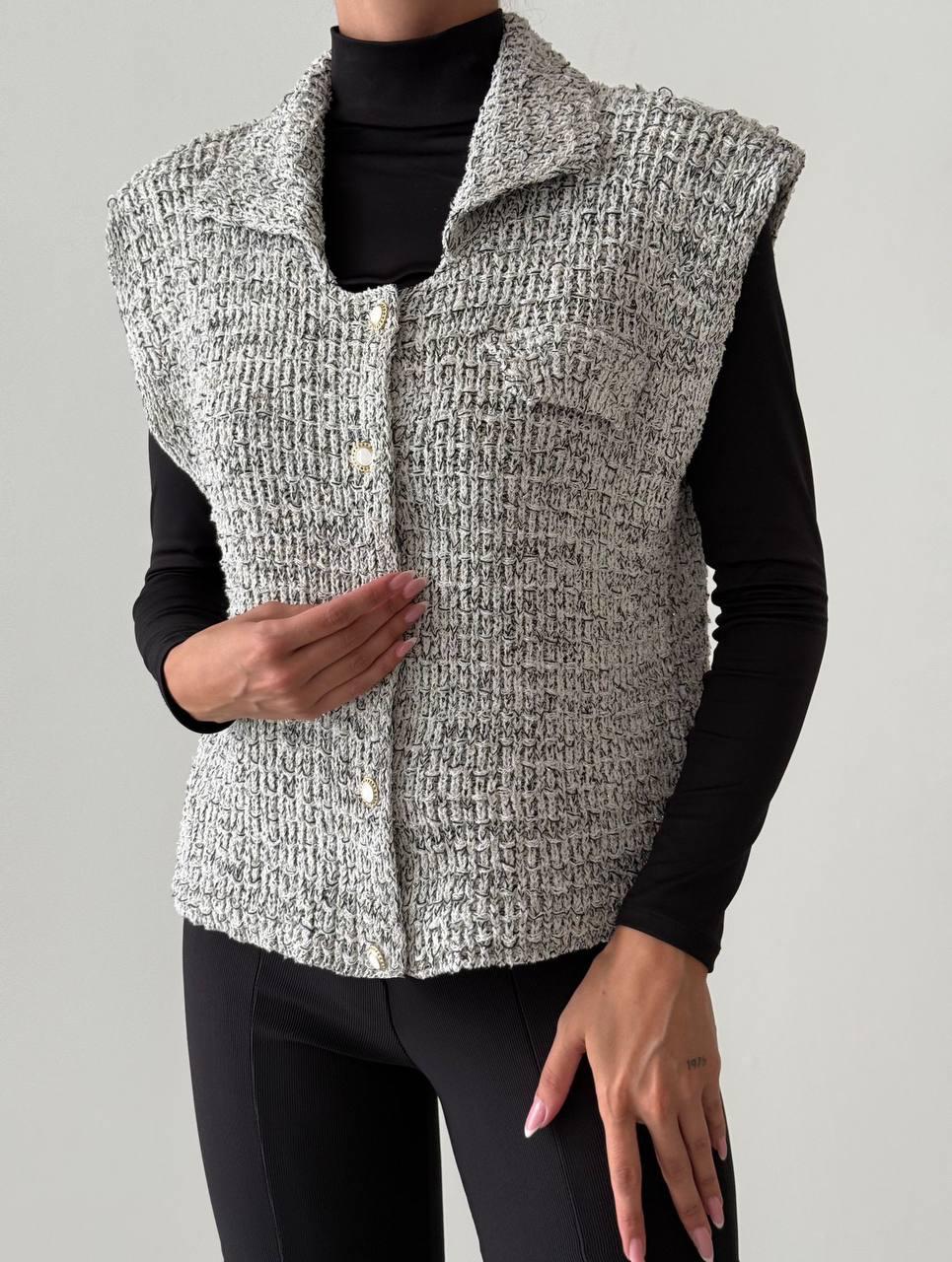 An elegant layering piece featuring a textured tweed weave and a sharp collar. It fastens with delicate pearl-look buttons and includes chest flap pockets. Perfect for smart-casual wear, layer it over a turtleneck or blouse for a refined, preppy look.